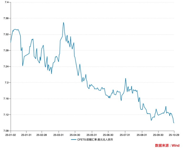 北京时间10月30日(周四)凌晨,美联储宣布将联邦基金利率目标区间下调25个基点到3.75%至4%之间的水平,这是美联储年内第二次降息。美联储降息进一步推动美元走弱,叠加央行稳汇率政策保持力度、国内权益市场表现出色吸引外资流入等因素,人民币汇率短期内持续走强。