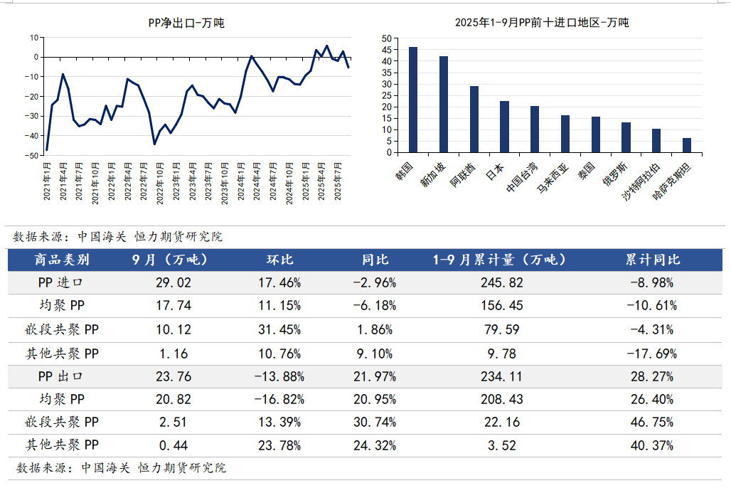 在进口增量和出口减量的作用下,我国PP单月重返净进口状态,9月净进口量约5.26万吨。