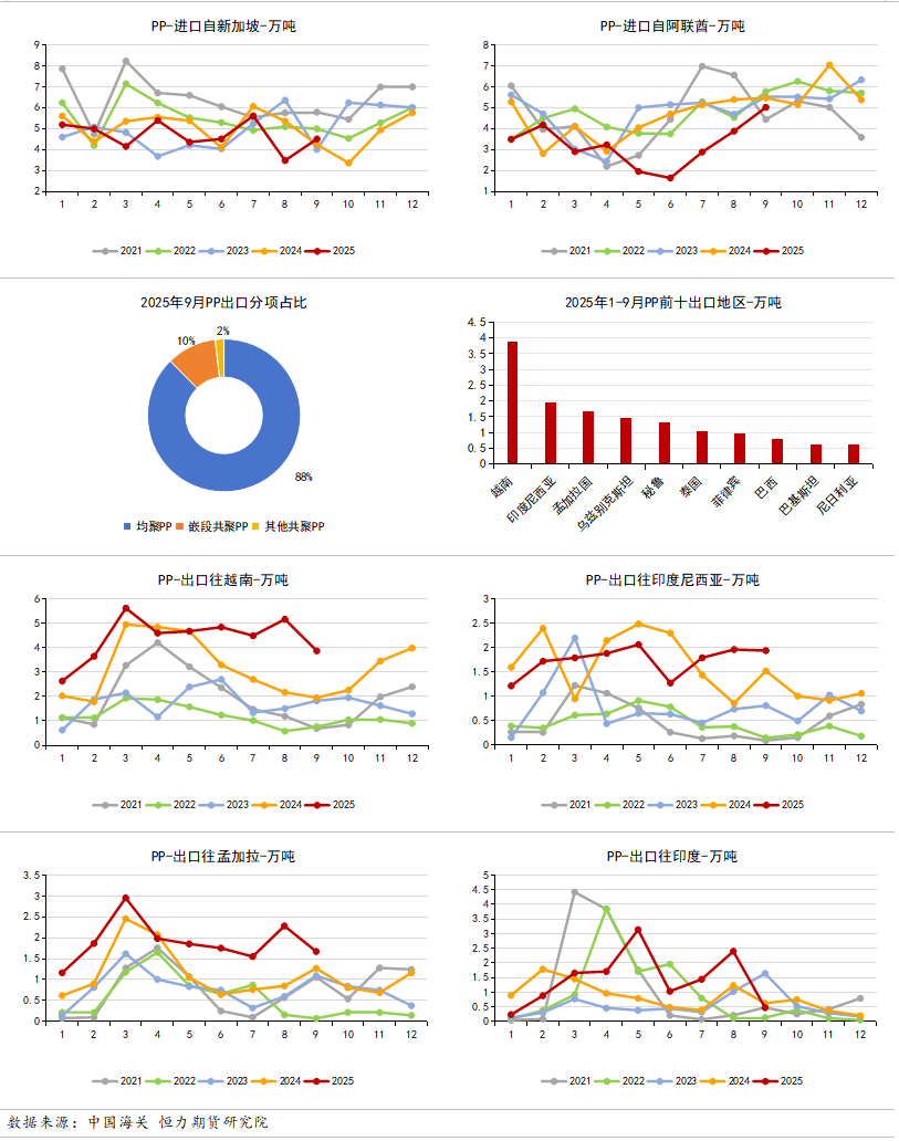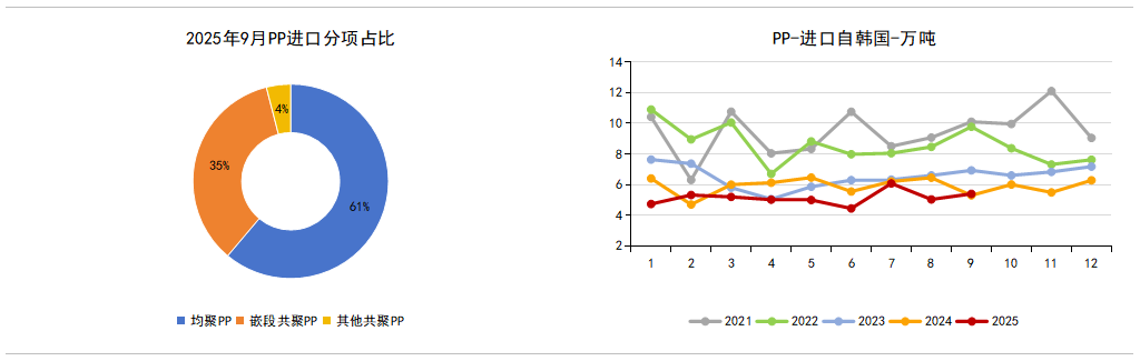 2025年9月中国进口PP29.02万吨,环比增长17.46%,同比减少2.96%;1-9月累计进口量为245.82万吨,同比下降8.98%。我国1-9月的PP前三进口来源国分别为韩国(46.28万吨,约占19%)、新加坡(42.17万吨,约占17%)和阿联酋(29.16万吨,约占12%)。从国别数据来看,PP单月进口增量主要来自阿联酋和新加坡。9月份我国从阿联酋进口5.01万吨PP,较8月增长29.29%,同时从新加坡的进口数量也环比增加29.57%到4.50万吨。韩国(5.40万吨,+7.21%,+1.84%)作为我国第一大PP来源国,本月进口增幅相对较小。