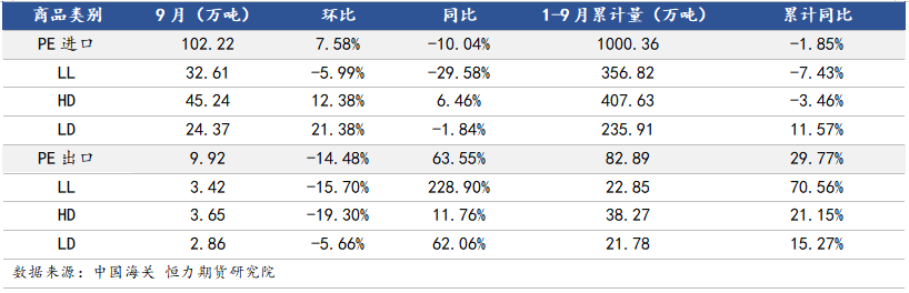 PE9月单月进口增加,出口下滑,本月净进口量为92.30万吨,较8月上升10.64%。