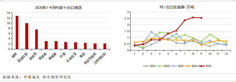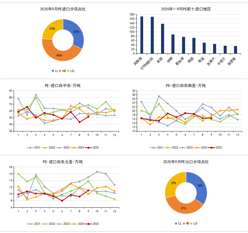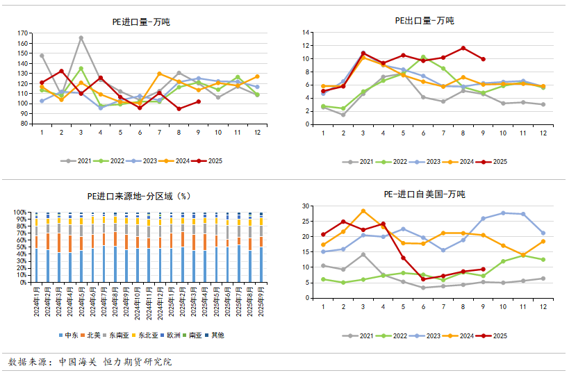 中国9月进口PE约102.22万吨,环比上涨7.58%,同比减少10.04%;1-9月进口量为1000.36万吨,累计同比下滑1.85%。从进口地区占比来看,1-9月我国PE主要来源地为中东(488.34万吨,约占49%)、北美(181.40万吨,约占18%)、东南亚(153.13万吨,约占15%)和东北亚(88.25万吨,约占9%)等。此外,1-9月自美进口量(136.68万吨,-27.69%)仍保持在我国PE进口国前三。9月份美国单月进口量继续小幅回升(9.42万吨,+8.36%,-54.07%),约占PE总进口9%,但体量较关税战前(参考4月美国占比19%)仍有较大差距,后续需持续关注关税政策变化。