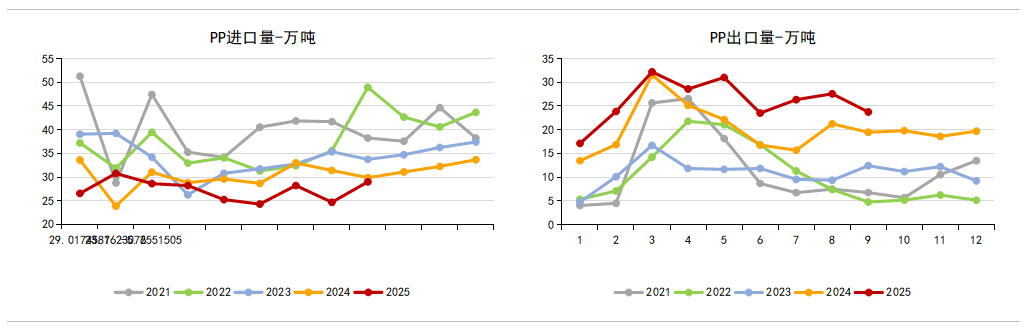 2025年1-9月我国PP净进口11.71万吨,较去年同时期净进口量(87.57万吨)下降86.63%。