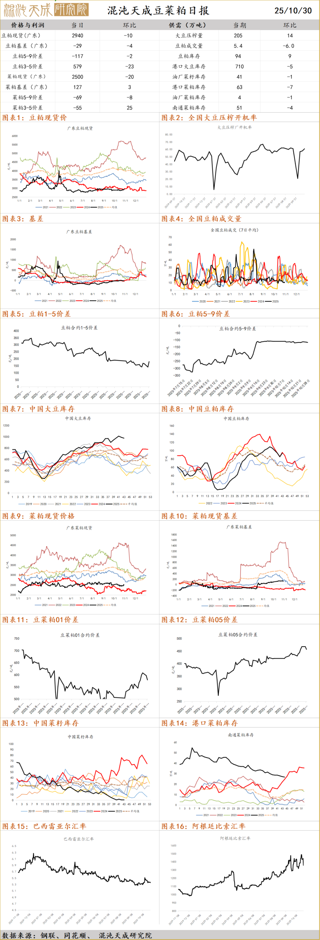 供需数据:10 月 24 日,全国主要油厂进口大豆库存 807 万吨,周环比下降 4 万吨,月环比上升 37 万吨,同比上升 194 万吨,较过去三年均值上升 368 万吨;豆粕库存 105 万吨,周环比上升 9 万吨,月环比下降 12 万吨,同比下降 2 万吨,较过去三年同期均值上升 36 万吨。
