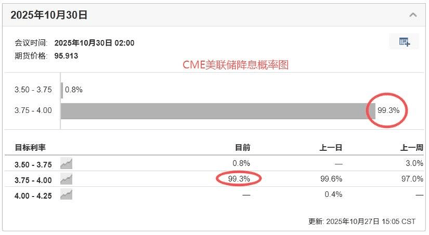 由于本次美联储利率决议降息25基点的预期已经被市场消化,所以,决议结果公布后,美元指数受到的影响不一定是降息导致的利空,而有可能是“买预期,卖事实”的利多。根据CME的数据,美联储本次降息25基点的概率高达99.3%,可以说是板上钉钉。越是在预期极端一致的情况下,美元指数越容易出现反逻辑行情。