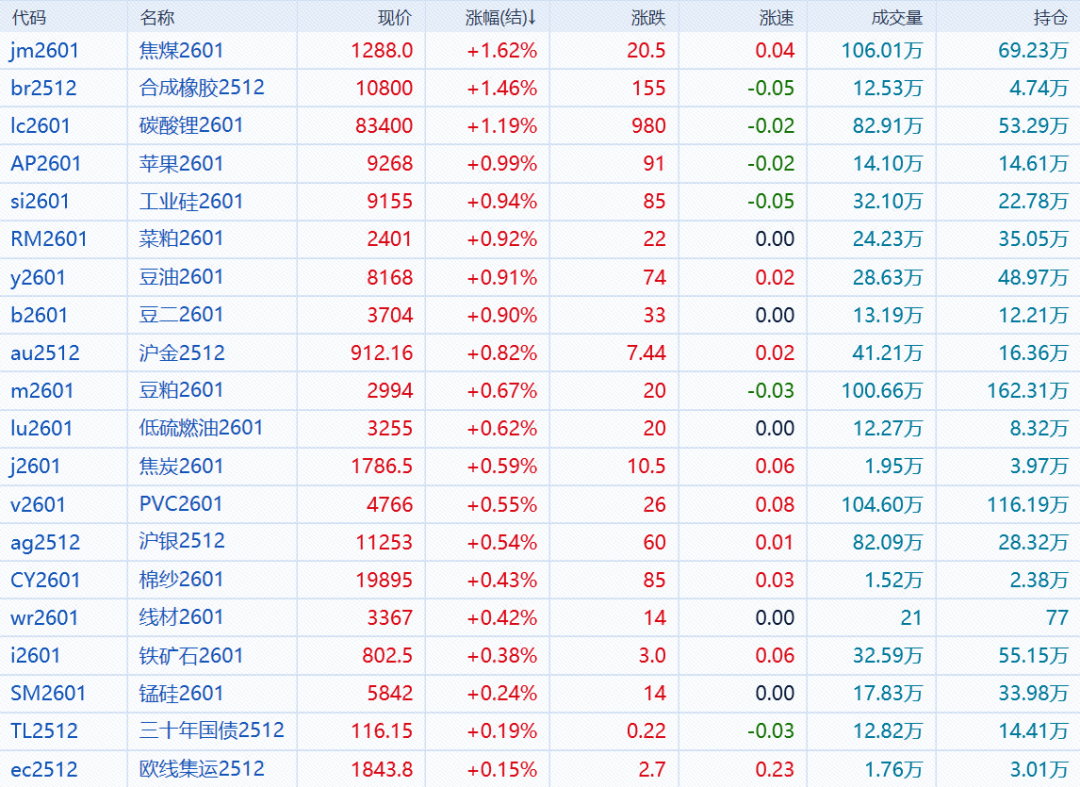 10月30日,午市收盘,国内期货主力合约涨跌不一。焦煤、丁二烯橡胶、碳酸锂涨超1%。跌幅方面,玻璃、红枣、生猪跌超2%,甲醇、烧碱、燃料油、纯碱、乙二醇(EG)、纯苯跌超1%。