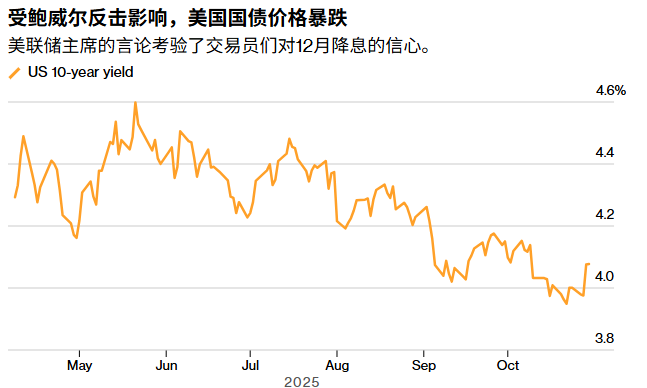 美国国债市场周三大跌后横盘整理,此前市场因美联储主席杰罗姆.鲍威尔的发言,对12月是否连续第三次降息陷入怀疑。具体来看,10年期美债收益率周四持平于4.08%,前一交易日曾飙升10个基点。