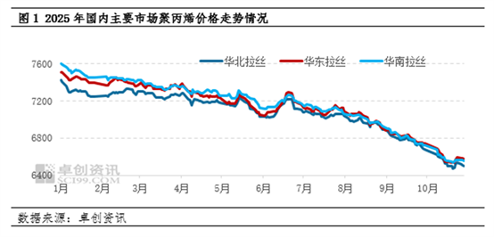 9月以来PP价格持续下行,尤其国庆节后归来市场跌幅明显。虽进入季节性旺季,但需求总体体感偏弱,下游工厂批量采购难现,加之国庆节前中上游企业基于降库需求出货意愿较强,多重压力下PP价格承压下行,此外上游原料价格下跌拖累节后PP现货市场,中美关系变化令业者对后市信心不足,市场跌幅较为明显。虽近期油价反弹向上,市场情绪有所好转,PP市场止跌企稳,但仍难以扭转市场季节性旺季下跌的态势。以拉丝为例,据卓创资讯数据统计,截至10月29日,华东拉丝均价在6585元/吨,较9月下跌230元/吨,跌幅在3.37%。