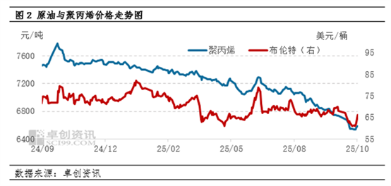 成本端来看,上游原料价格下移对PP成本支撑减弱,拖累10月市场走势。具体来看,月内国际油价先抑后扬,月均价继续下移。月内基本面过剩利空叠加中美关税存升级风险打压市场宏观风险偏好,中上旬油价持续下行,一度挑战4月年内最低点;月下旬地缘与宏观相继出现利好,油价反弹回升,重回震荡区间,但月均价仍有下移。据卓创资讯数据统计,截至10月28日,本月美原油均价59.98美元/桶,较上月跌5.59%,同比去年跌16.18%;布伦特原油均价63.8美元/桶,较上月跌5.59%,同比去年跌15.36%。