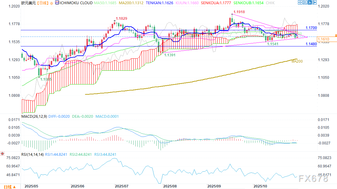 价格走势处于对称三角形形态的下沿区域,相对强弱指数(RSI)跌破50中性关口后持续向下。