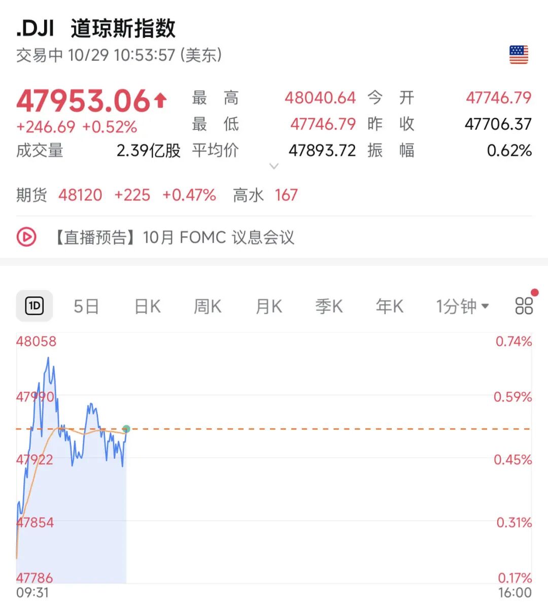 当地时间10月29日,美股三大股指全线上涨,截至发稿,道指上涨0.52%,一度站上48000点,为道指首次突破48000点;标普500指数上涨0.25%,纳指上涨0.61%。