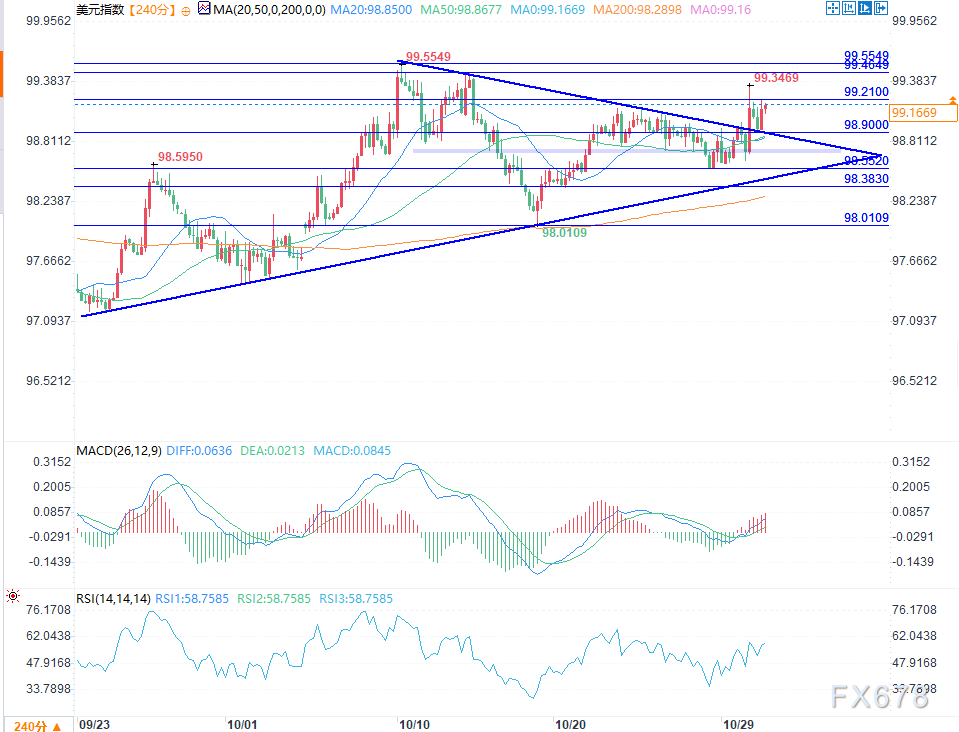 相对强弱指数(RSI)维持在59附近,表明买盘兴趣稳定且未出现超买压力。若能持续突破99.21,可能打开通往99.46和99.55的上行空间;若跌破98.90,则可能推动指数回落至98.56支撑位。
