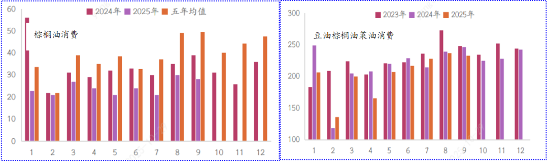 图表2:棕榈油和三大油脂月度消费量 (单位:万吨)