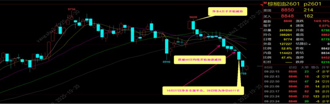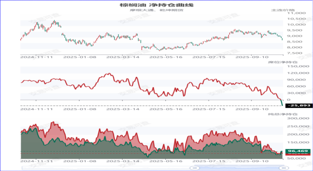 资金面的偏空态势进一步强化了中期调整逻辑。外资席位中,乾坤与摩根两大交易席位的持仓变化具有标志性意义 —— 自棕榈油价格在 9600 元附近时,两大席位便开始大规模减仓多单;待期价跌破 60 日均线后,更是直接清空多单并反手做空,持仓结构从净多单 8 万手转变为净空单 2 万手。目前市场大多头尚未回归,资金做空力量仍占据主导,短期内资金面偏空的格局难以逆转,进一步制约了棕榈油价格的反弹高度。