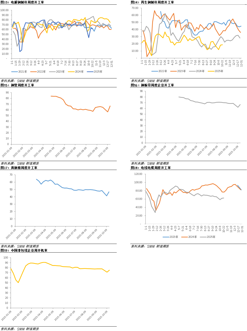 需求方面,据SMM数据显示,10月23日当周电解铜制杆开工率为62.5%,环比上涨19.06个百分点。10月23日当周再生铜制杆开工率为18.29%,环比上涨6.36个百分点。10月23日当周铜管开工率为66.77%,环比上涨10.31个百分点。10月23日当周铜板带开工率为66.69%,环比上涨4.69个百分点。10月23日当周黄铜棒开工率为46.82%,环比上涨5.52个百分点。10月23日当周电线电缆开工率为61.91%,环比上涨3.38个百分点。10月23日当周电线电缆开工率为75.2%,环比上涨3.87个百分点。总体来说,传统需求旺季并未如期到来,铜价高位抑制下游采购积极性。
