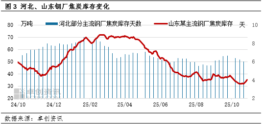 10月份由于焦化厂检修较多,且有国庆节假期,多数钢厂焦炭到货减少,库存维持下滑,截至10月23日,卓创资讯统计的45家主流钢厂焦炭库存可用天数7.18天,较10月初略降0.4天。截至10月29日,山东某主流钢厂焦炭库存月均值32.87万吨,较上月减少4.98万吨。目前钢厂焦炭库存整体维持中位水平,后期焦煤价格仍有上涨预期,多数钢厂采购焦炭积极性较高,有增库需求。