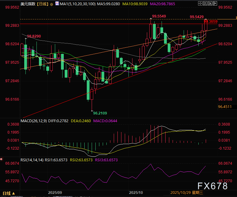 汇通财经APP讯——周四(10月30日)美元指数延续涨势,突破月内最高价,也是近期最关键的价格关口,目前涨0.38%,交投于99.50附近,受美联储鹰派降息影响,以及中美贸易缓和提振,美元指数持续走强。值得注意的是,目前美国10年期国债提前拉伸0.8%,而美股盘前集体下跌,避险情绪一度上升支撑了美元指数的上行。