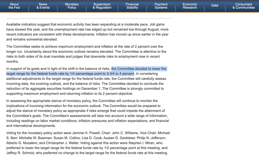 北京时间10月30日凌晨,美联储公布利率决议,如期降息25个基点,将联邦基金利率目标区间下调到3.75%至4.00%之间。同时,美联储决定从12月1日起结束缩减资产负债表(缩表)的计划。