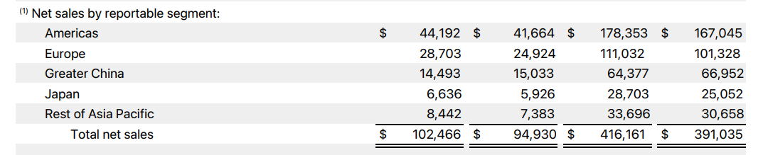 苹果2025财年第4财季全球营收1024.7亿美元创同期新高,同比增长7.94%;大中华区营收144.93亿美元,下降3.59%