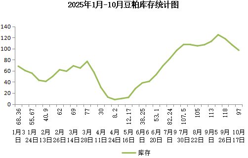 库存:4月以来,受关税政策影响,进口大豆到港数量不断下降,豆粕库存创历史新低,下滑至个位数。5月初进口大豆到港数量恢复,豆粕库存陆续回升。6月更是不断增加,7月豆粕库存也持续高位,8月更是突破100万吨。9月豆粕库存持续110万吨以上,中旬更是高达120多万吨。十一过后,库存数量下滑,重回100万吨以下。