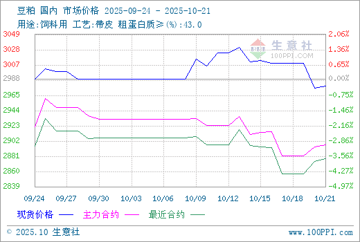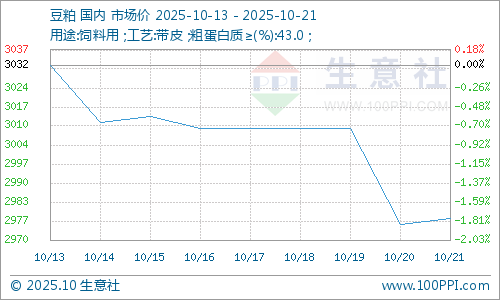 据生意社商品行情分析系统,10月13日开始,利空主导,豆粕行情震荡下跌。10月13日,豆粕市场均价3032元/吨,10月21日,豆粕市场均价2978元/吨,周期内价格下跌1.78%。