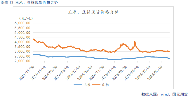 截至10月21日,玉米现货均价2259.41元/吨,较上周环比下跌34.9元/吨,豆粕现货均价2999.14元/吨,较上周环比上涨42.57元/吨。饲料原料价格小幅下跌。玉米从基本面来看,东北新粮上市量持续增加,丰产预期逐步兑现,前期因气温不利于存储,农户售粮积极性较高,近期降温改善存储条件后售粮意愿下滑。华北玉米价格延续弱势,收割期显著延后,市场以潮粮为主,且持续阴雨导致收粮陷入停滞。下游饲料企业新季玉米采购以东北粮为主,价格随季节下行。当前玉米价格呈季节性下跌趋势。 豆粕从基本面看,今年下半年以来中国未从美国采购大豆,且此前阿根廷取消出口税窗口期内的采购量已能满足明年一季度大豆缺口,即便美国进一步加征关税,对国内大豆供应的影响也十分有限。据海关数据,10月国内大豆进口量将逐步回落,但豆粕库存仍会维持阶段性高位,若后续养殖端需求暂无明显增长,豆粕库存大概率延续累库趋势,市场仍将面临去库压力。