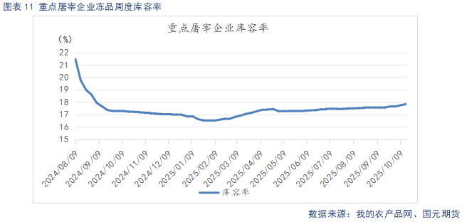 截至10月21日,重点屠宰企业开工率为35.25%,较上周环比上升4.5%。冷冻肉库容率17.84%,较上周环比上升0.11%。居民、餐饮的节前储备逐步消耗,气温逐步下降后,居民饮食倾向肉类,而低价进一步刺激终端消费回升,需求较节后一周,有较大改善。冻库库存方面,冻肉走货缓慢,且猪价仍处低位,存在被动入库的现象,冻品去库缓慢。需要注意的是,猪价低迷时,屠企低价分割入库,一定程度上缓解市场供应压力,在下方支撑猪价。但猪价回暖,低价冻品投放市场,将对鲜肉消费造成一定冲击,抑制猪价上方空间。