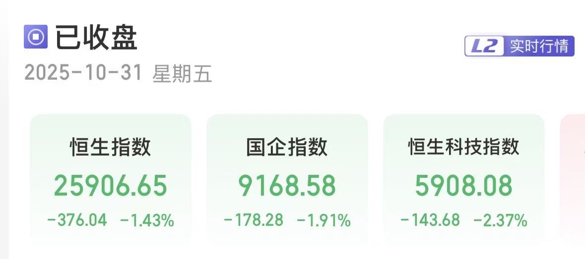 上证报中国证券网讯(刘禹希 记者 严晓菲)10月31日,港股三大指数集体收跌。截至收盘,恒生指数跌1.43%,报25906.65点;恒生国企指数跌1.91%,报9168.58点;恒生科技指数跌2.37%,报5908.08点。