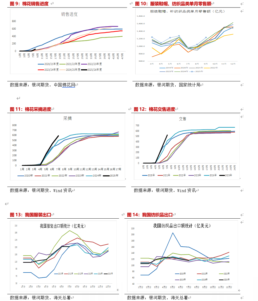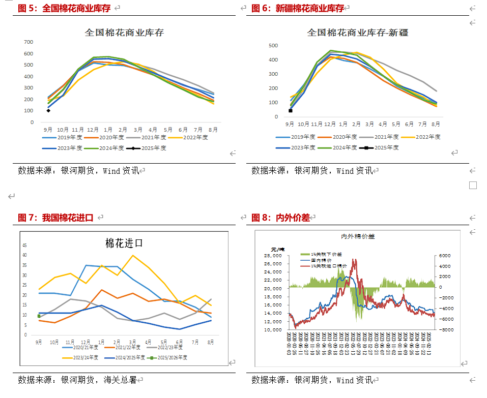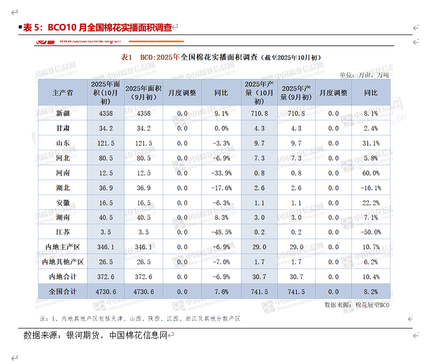 新作方面情况:根据中国棉花信息网10月初调查结果显示,将2025年全国棉花种植面积4730.6万亩,其中新疆棉花种植面预计在4358万亩,同比增幅9.1%;根据近三年棉花平均单产估算,将总产上调至741.5万吨,同比增加8.2%。