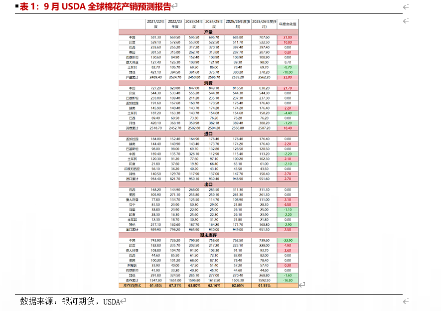 根据USDA最新全球棉花产销预测来看,9月25/26年度棉花产量较上月相比有所调增,调增23万吨至2562万吨,其中中国调增22万吨、印度调增11万吨。