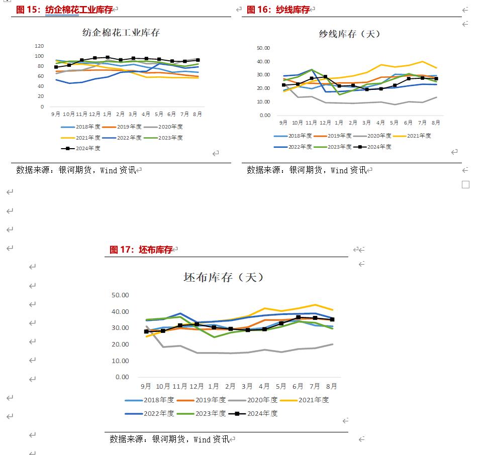 根据中国棉花信息网最新数据,根据中国棉花信息网,截至9月中旬我国棉纺织企业棉花工业库存为86.21万吨,环比减少3.02万吨;棉纺织企业纱线库存25.43天,坯布库存31.56天。