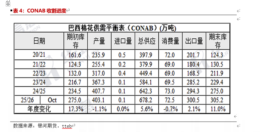 巴西方面:据巴西国家商品供应公司(CONAB)10月份发布的2025/26年度首期产量预测数据:2024/25年度巴西棉花总产预期为407.7万吨,较上一月调增1.6万吨,种植面积稳定在208.61万公顷,单产上调至130.3公斤/亩。2025/26年度巴西棉花总产预期为403.1万吨,同比下调4.6万吨,种植面积上调至213.8万公顷,单产下调至125.7公斤/亩。Conab继续上调24/25年度巴西棉产量评估,消费小幅下调,整体期末库存上调。新年度种植面积上调但单产预期下调。