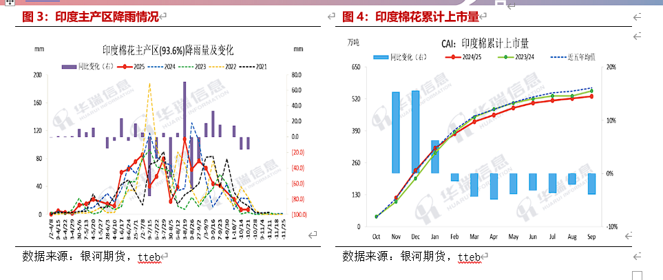 印度降雨情况,截至2025/10/16至2025/10/22当周,印度棉花主产区(93.6%)周度降雨量为6.9mm,相对正常水平低3.8mm,相比去年同期低15.9mm。2025/10/01至2025/10/22棉花主产区累计降雨量为38.2mm,相对正常水平低10.6mm。本周印度降水依然偏少,西南季风撤退天气干燥为主。