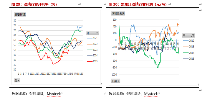 酒精行业,10月由于玉米现货大幅回落,酒精利润盈利回升,行业开机率持续回升。10月中旬出现过短暂较高盈利后,由于玉米价格短期反弹,酒精利润又开始回落。截止10月27日,黑龙江利润为-148元/吨,河南酒精利润为-64元/吨。由于华北等地收获时降雨影响,玉米霉变率较高,预计酒精用玉米供应宽松,玉米现货仍有回落空间,开机率会继续回升,酒精利润有所好转。预计11月酒精行业开机率仍会继续上升,酒精行业对玉米消耗量也会继续增加。