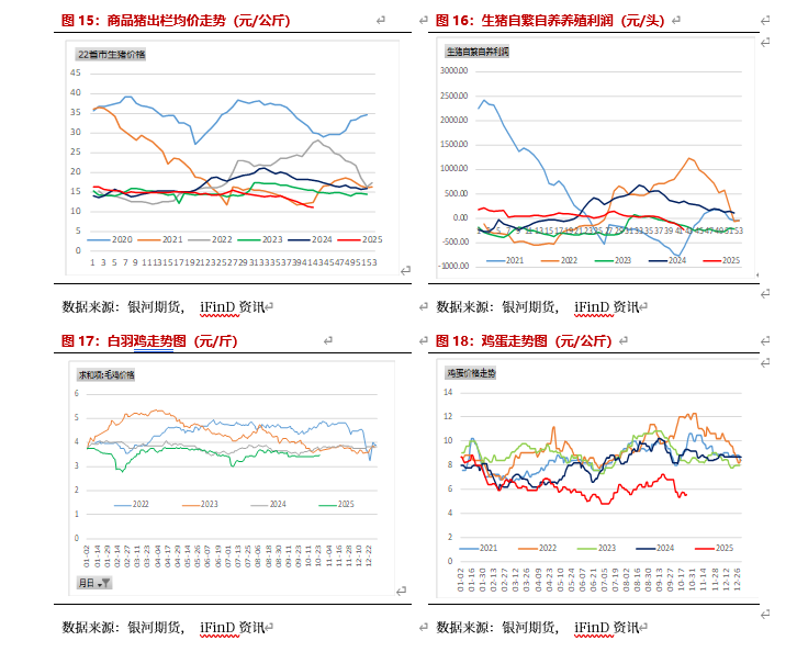 饲料需求继续增长。根据饲料工业协会数据,9月饲料产量3036万吨,1-9月累计24653万吨,同比增6.6%。国家统计局显示,9月饲料产量3129万吨,1-9月累计25070万吨,同比增6.4%。生猪养殖利润继续下降,生猪存栏高于去年同期。截止10月23日,自繁自养利润每头-149元,外购利润-279元。9月123价规模场商品猪存栏3685万头,环比增加1.44%,同比增5.29%。白羽肉鸡利润仍亏损,但蛋禽存栏仍较高,卓创数据预测在产蛋鸡存栏10-1月,分别为13.6亿只、13.6亿只、13.56亿只、13.47亿只仍处于历史高位。进入11月,预计饲料需求仍会增长。