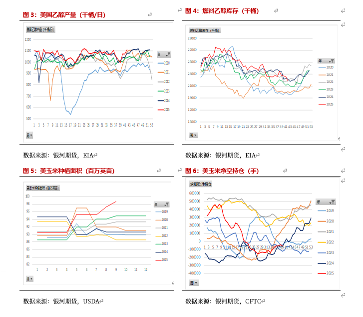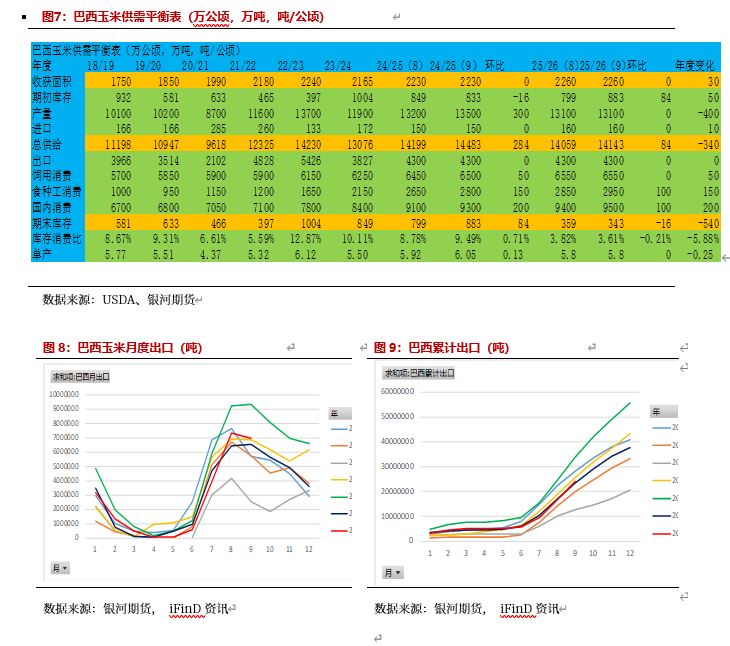 由于10月报告期间恰逢政府停摆,USDA月度数据暂未发布,我们仍以9月报告作为基准。9月USDA报告供应宽松,2025年9月USDA报告全球玉米产量环比减少,但同比增加较多,消费增加。25/26年度9月全球玉米产量预期12.87亿吨,略低于上月12.88亿吨,高于去年同期12.23亿吨,同比增5767万吨。其中饲用玉米消费8.11亿吨,高于去年7.87亿吨,国内总消费12.81亿吨,高于去年的12.49亿吨,预计期末库存2.81亿吨,低于去年的2.84亿吨,库销比21.97%。其中美国产量4.27亿吨,饲用1.55亿吨,食用及工业消费1.77亿吨(乙醇用酒精1.42亿吨),出口7557万吨。巴西产量1.31亿吨,饲用6550万吨,食用工业消费2950万吨,出口4300万吨。阿根廷产量5300万吨吨,出口3700万吨。乌克兰产量3200万吨,出口2550万吨。25/26年度新季玉米产量处于高位,全球供应宽松。