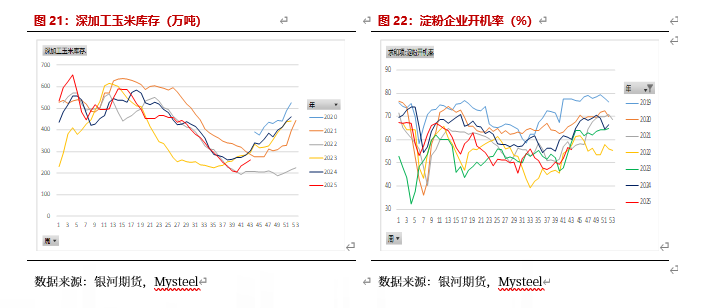 2025年10月玉米现货大幅回落,副产品价格相对稳定,淀粉企业已经盈利。淀粉企业开机率上升,但下游需求仍偏弱,淀粉库存仍处于历史高位。截止10月22日,96家深加工玉米库存262.2万吨,高于上月同期的212万吨,但低于去年同期的303万吨。黑龙江玉米库存101万吨,高于去年的33.9%,山东玉米库存37万吨,低于去年50%。淀粉企业开机率持续回升,截止10月22日,淀粉企业开机率为55.62%。淀粉库存高于去年,淀粉企业利润增加。截止10月27日,黑龙江淀粉利润为20元/吨,山东利润135元/吨。截止10月22日,淀粉库存为114万吨,月增幅0.1%,年同比增幅43.4%。由于淀粉行业利润较好,但下游需求仍偏弱,淀粉库存处于高位,预计11月随着新季玉米供应仍宽松,玉米现货仍有下跌空间,淀粉行业利润仍处于高位。