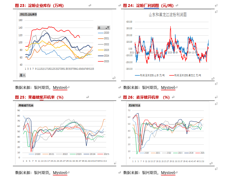由于玉米现货价格大幅下跌,副产品价格稳定,淀粉企业利润较好。但玉米淀粉需求仍偏弱,库存处于过去几年高位,且木薯进口进口量较高,新季玉米大量上市后深加工开机率会增加,淀粉库存难以去化。华北玉米由于质量较差,深加工玉米供应会充足,开机率会维持高位,且玉米价格也相对较低,11月淀粉企业利润仍会维持高位。但2025年副产品价格比去年高100元/吨左右,淀粉价格远低于去年水平。预计华北淀粉底部在2650元/吨附近,东北淀粉在2400元/吨附近。01淀粉仍会维持底部震荡,且01玉米和淀粉价差预计在270-320之间波动。