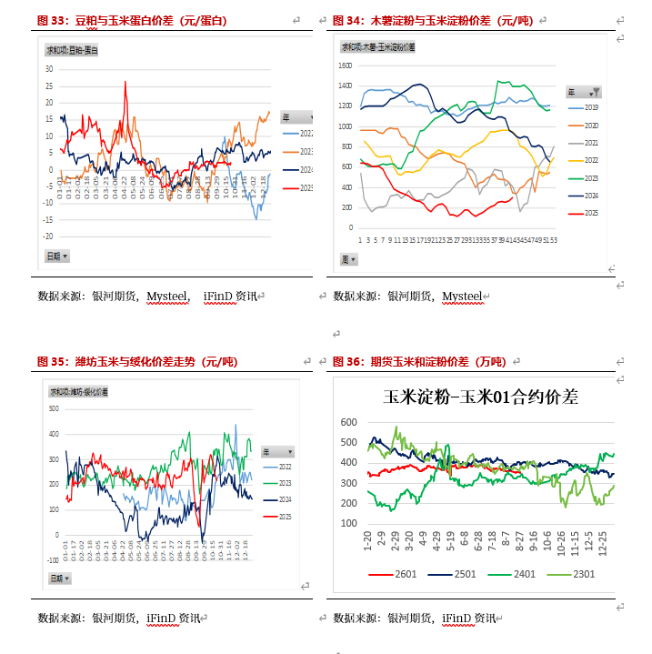 淀粉下游仍偏弱,木薯淀粉进口量增加较多,替代玉米淀粉消费。2025年木薯淀粉进口量增加,且木薯淀粉与玉米淀粉价差较低,部分玉米淀粉会被木薯淀粉继续替代,淀粉需求会受抑制。截止10月23日,木薯淀粉与玉米淀粉价差在298元/吨,低于去年905元/吨的价差,且下游淀粉糖与白糖价差较低,整体淀粉需求仍不乐观。1-9月木薯淀粉进口累计383万吨,高于去年同期的279万吨,木薯淀粉高于100多万吨,替代玉米淀粉下游需求。