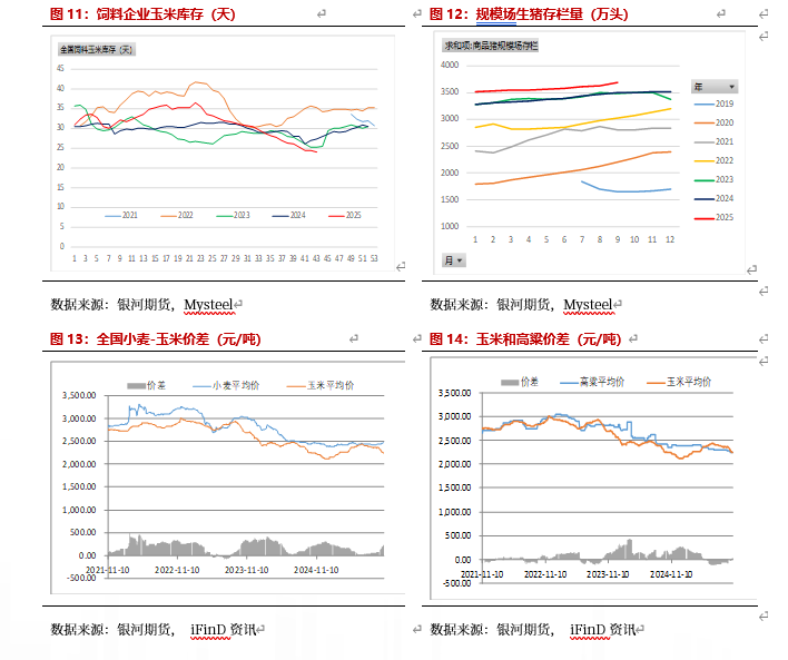 10月中美关系缓和,美玉米可能下调单产,且美玉米远低于种植成本,预计美玉米12合约400美分/蒲有支撑,但考虑到美玉米产量仍是新高,25/26年度美玉米预计仍会底部震荡。对于国内玉米,由于华北前期降雨影响,玉米霉变较高,且收获延迟,集中卖粮时间延后,预计11月初华北卖压仍较大,10月底11月初吉林玉米集中上市,玉米现货仍会下跌,但考虑到贸易商及下游企业可能会部分建库存,叠加种植成本附近农户会惜售,预计2050元/吨的收购价支撑较强。但11月中旬,吉林卖压减轻,玉米仍有小幅反弹。预计11月北港收购价在2050-2130之间波动,期货01在2080-2150之间波动,05玉米在2190-2260之间波动。