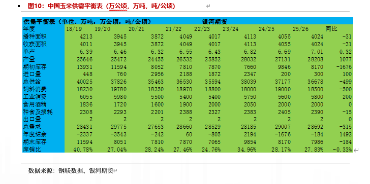根据我们最新玉米供需平衡表,产量增加较多,需求会略下降,但玉米结转库存仍较大,玉米供应仍偏紧。25/26年度地租下降,单产提高,全国产量增加较多。根据调研数据,东北黑龙江地租平均下降70元/亩,但单产高于去年,按照单产1700斤/亩的产量,折算到港平仓价基本在2100元/吨附近。根据钢联调研数据,25/26年度玉米产量为27828万吨,比上年度增加697万吨。但根据我们的调研及数据,我们认为东北单产在10%左右,东北产量增加1000万吨左右,华北考虑到收获时降雨影响,预计产量与去年持平,西北地区产量增加200万吨左右,预期全国玉米产量增加1100-1200万吨。