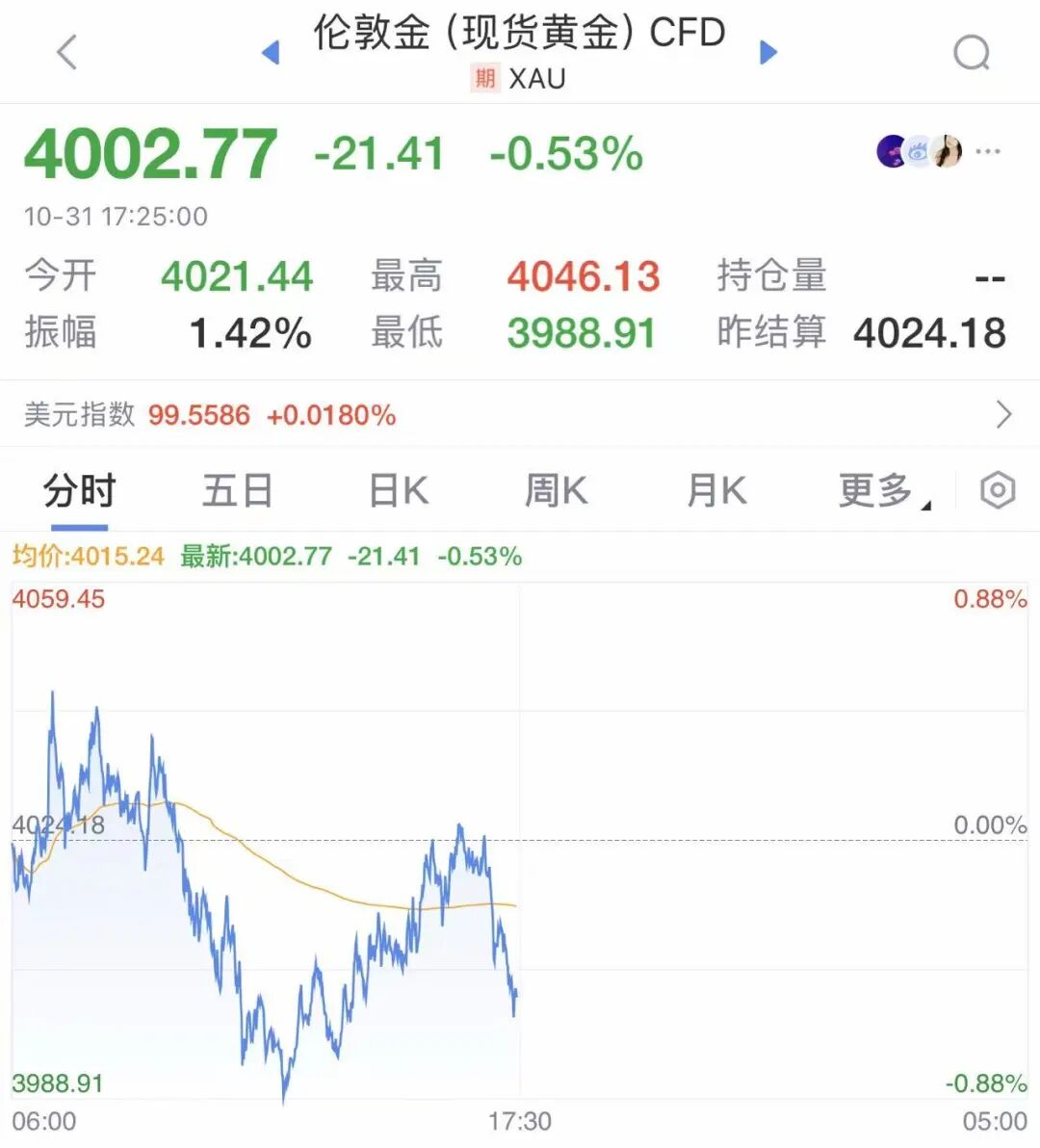 10月31日,现货黄金持续震荡,盘中一度跌破4000美元大关。而就在前一天,现货黄金大涨2.37%。