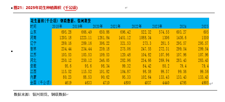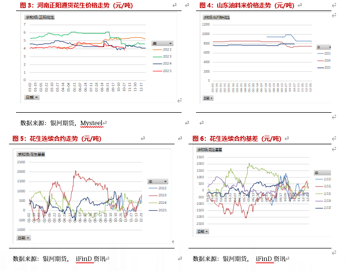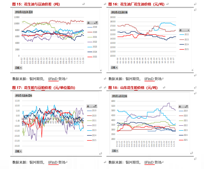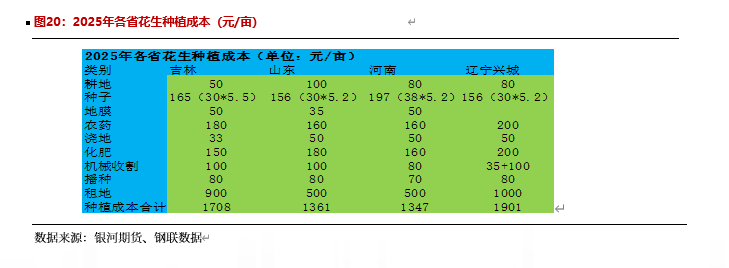 25年花生种植面积同比去年增加,虽然河南等地产量部分减产,但全国花生产量略高于去年。我们对河南和吉林等地种植成本进行分析,成本去掉地租后,基本在600(不包含种子)-800元/吨,大部分在800元/吨,种子成本略下降。由于河南等地一年两茬,种植成本较低,我们对吉林等地种植成本进行分析,吉林地租较去年下降100-200元/亩,包含地租成本在1700元/亩,按照450斤/亩(花生米)进行计算,吉林花生米成本在3.5-3.8元/斤。考虑到河南地区降雨影响,收获成本增加,但东北地区成本维持稳定。
