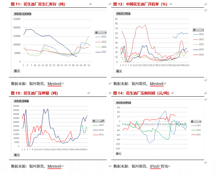 10月花生进口量仍偏低,油厂仍未大量收购,河南等地花生质量较差,花生现货大幅下跌,东北花生价格偏强。下游需求仍偏弱,油厂花生库存处于低位,但开机率仍偏低。花生油和花生粕价格相对偏弱,花生油厂盈利较高。受河南等地降雨影响,盘面01花生冲高回落。