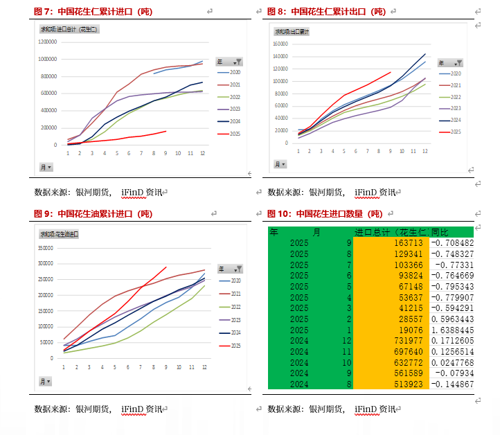 全球花生产量增加,但花生进口大幅减少。根据FAS数据,预计2025年全球花生产量5178万吨,其中中国产量1900万吨,印度735万吨,塞内180万吨,苏丹100万。美国农业部最新数据,2025年全球花生产量5174万吨,中国大约1900万吨,印度735万吨,尼日利亚430万吨。2024年全球花生压榨量为1928万吨,占比37.6%。2024年全球进口花生量为426万吨,出口花生为482万吨,占比9.4%。但由于苏丹和塞内进口量低于预期,进口花生进口量大幅低于去年。