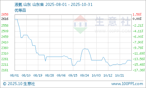 10月国内液氨并未延续此前两个月的跌势,市场逐渐企稳,市场先跌后涨,月底市场价格基本回到月初水平。据生意社商品行情分析系统,山东地区液氨10月跌幅在0.44%。截止月底,山东地区液氨主流价格在2200-2270元/吨。