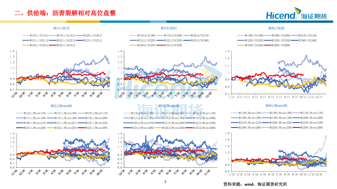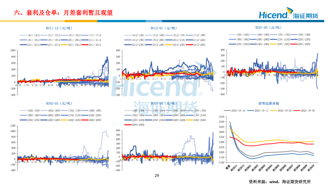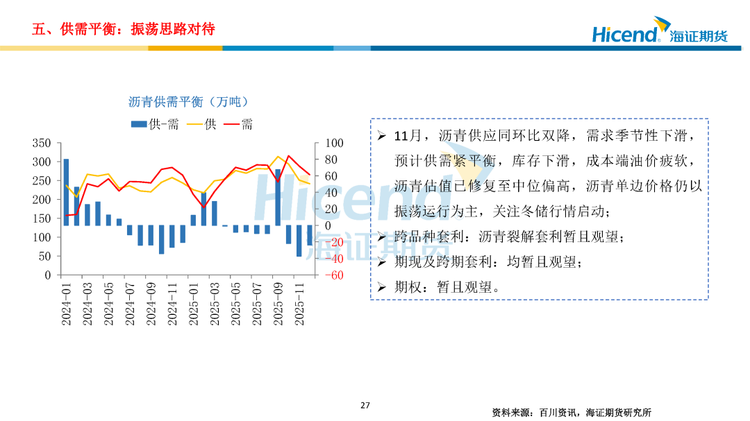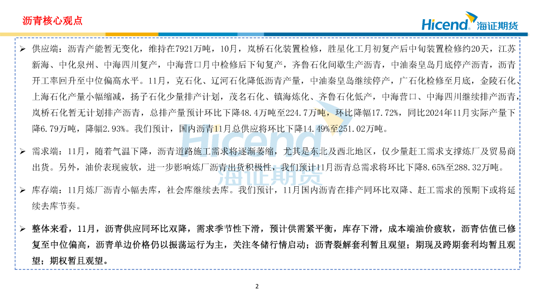 整体来看,11月,沥青供应同环比双降,需求季节性下滑,预计供需紧平衡,库存下滑,成本端油价疲软,沥青估值已修复至中位偏高,沥青单边价格仍以振荡运行为主,关注冬储行情启动;沥青裂解套利暂且观望;期现及跨期套利均暂且观望;期权暂且观望。