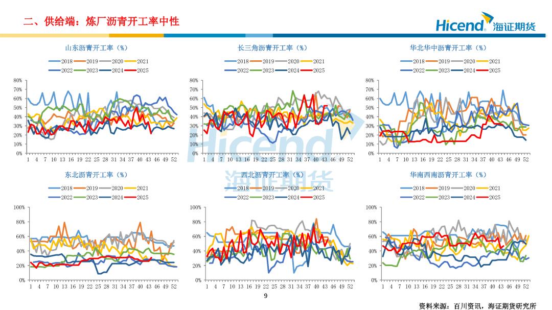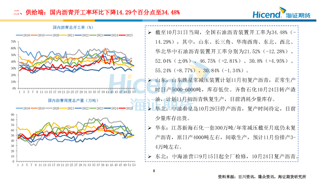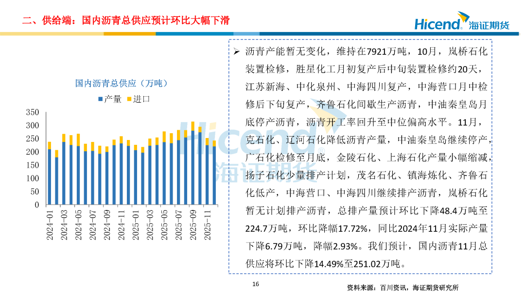 供应端:沥青产能暂无变化,维持在7921万吨,10月,岚桥石化装置检修,胜星化工月初复产后中旬装置检修约20天,江苏新海、中化泉州、中海四川复产,中海营口月中检修后下旬复产,齐鲁石化间歇生产沥青,中油秦皇岛月底停产沥青,沥青开工率回升至中位偏高水平。11月,克石化、辽河石化降低沥青产量,中油秦皇岛继续停产,广石化检修至月底,金陵石化、上海石化产量小幅缩减,扬子石化少量排产计划,茂名石化、镇海炼化、齐鲁石化低产,中海营口、中海四川继续排产沥青,岚桥石化暂无计划排产沥青,总排产量预计环比下降48.4万吨至224.7万吨,环比降幅17.72%,同比2024年11月实际产量下降6.79万吨,降幅2.93%。我们预计,国内沥青11月总供应将环比下降14.49%至251.02万吨。
