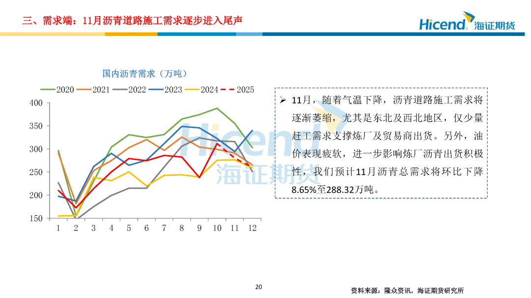 需求端:11月,随着气温下降,沥青道路施工需求将逐渐萎缩,尤其是东北及西北地区,仅少量赶工需求支撑炼厂及贸易商出货。另外,油价表现疲软,进一步影响炼厂沥青出货积极性,我们预计11月沥青总需求将环比下降8.65%至288.32万吨。
