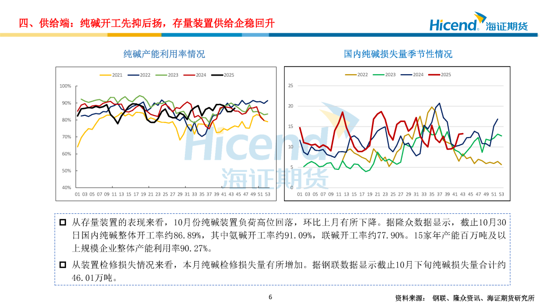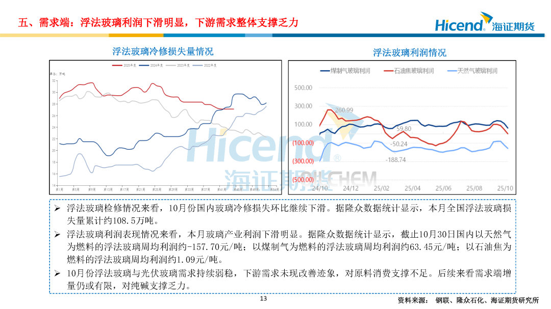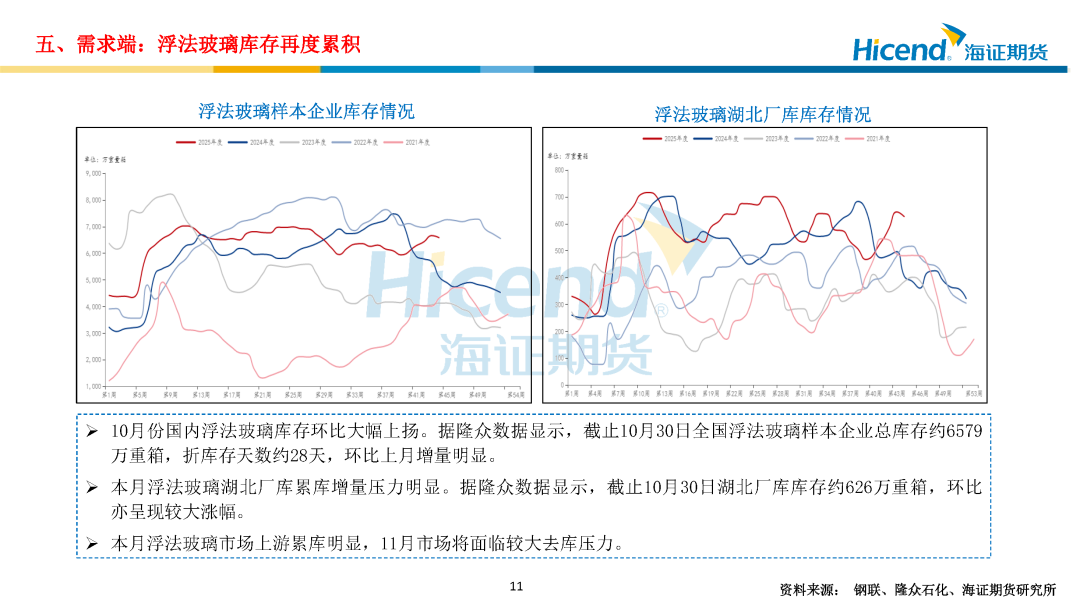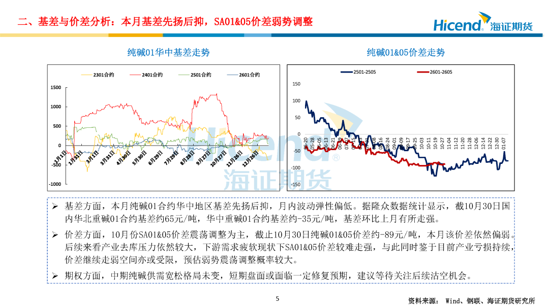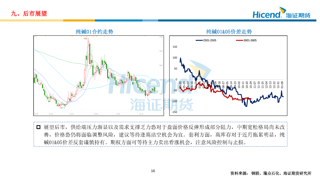 后续来看,鉴于纯碱负荷稳步回升以及需求端支撑乏力,我们认为后续纯碱供需仍或趋于宽松,产业累库恐将继续抑制价格反弹动能,预估11月份纯碱盘面仍或面临部分调整风险,建议逢高沽空思路为宜。套利方面,高库存对于近月拖累明显,纯碱01&05价差反套谨慎持有。期权方面可等待主力卖出看涨机会,注意风险控制与止损。