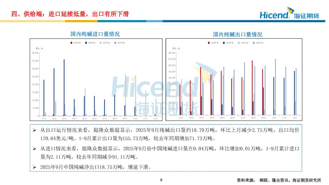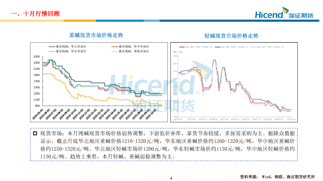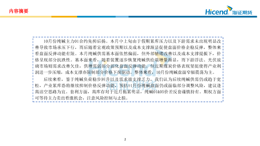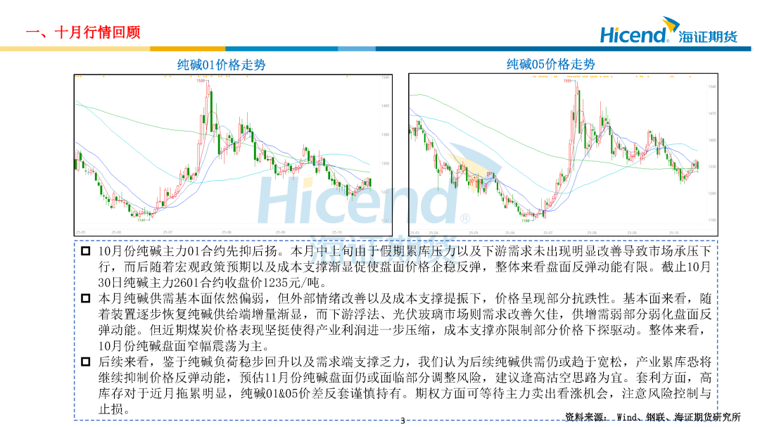 10月份纯碱主力01合约先抑后扬。本月中上旬由于假期累库压力以及下游需求未出现明显改善导致市场承压下行,而后随着宏观政策预期以及成本支撑渐显促使盘面价格企稳反弹,整体来看盘面反弹动能有限。本月纯碱供需基本面依然偏弱,但外部情绪改善以及成本支撑提振下,价格呈现部分抗跌性。基本面来看,随着装置逐步恢复纯碱供给端增量渐显,而下游浮法、光伏玻璃市场则需求改善欠佳,供增需弱部分弱化盘面反弹动能。但近期煤炭价格表现坚挺使得产业利润进一步压缩,成本支撑亦限制部分价格下探驱动。整体来看,10月份纯碱盘面窄幅震荡为主。